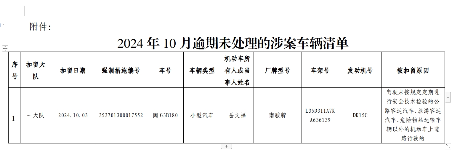 附件:2024年10月逾期未处理的涉案车辆清单