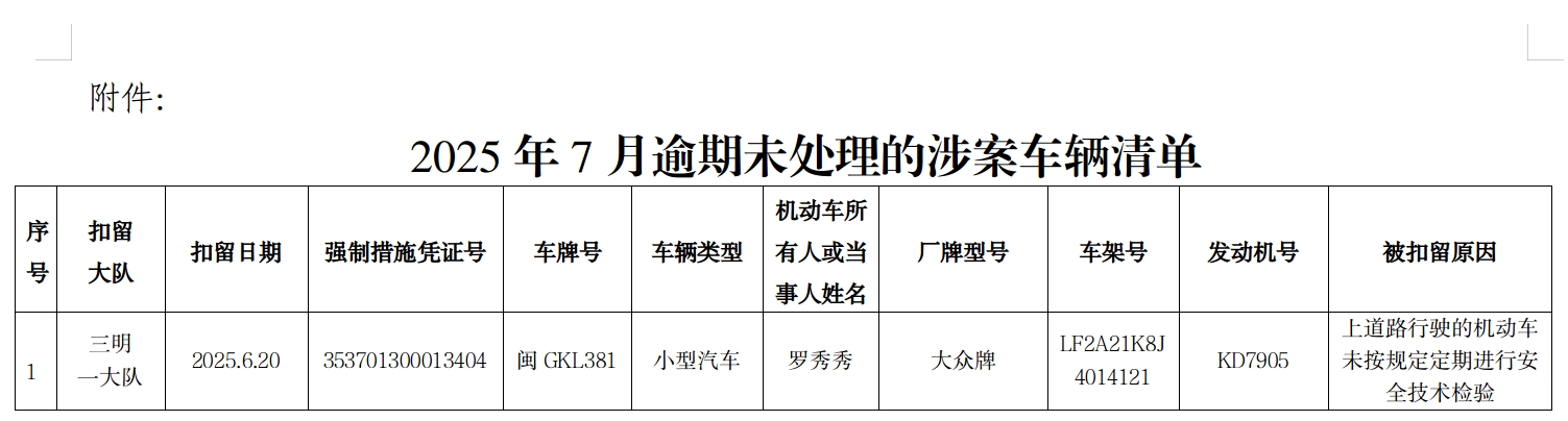 下列1辆机动车因交通违法被我队下属大队扣留,当事人逾期未提供检验合格标志,根据《中华人民共和国道路交通安全法》第一百一十二条第三款和《中华人民共和国道路交通安全法实施条例》第一百零七条之规定,请当事人自本公告发布之日起三个月内到相关大队接受处理,自公告之日起三个月仍不来接受处理的,我队将对扣留的车辆依法处理。
