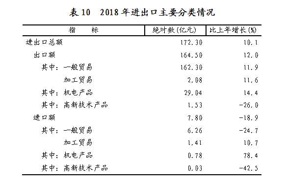 全年进出口总额172.30亿元,比上年增长10.1%。其中,出口164.50亿元,增长12.0%;进口7.80亿元,下降18.9%。进出口顺差156.70亿元,比上年增加19.40亿元。对“一带一路”沿线国家和地区出口54.27亿元,下降1.5 %。