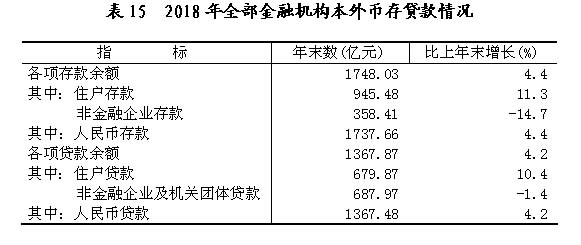 年末全市金融机构本外币各项存款余额1748.03亿元,比上年末增长4.4%;金融机构本外币各项贷款余额1367.87亿元,增长4.2%。