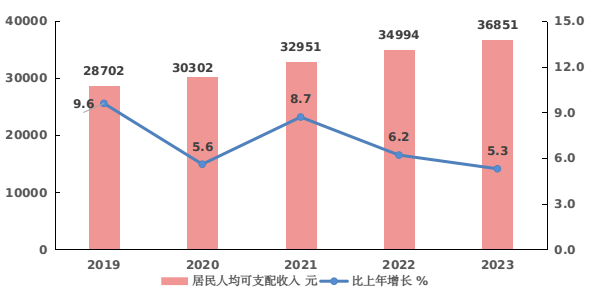 图7 2019-2023年居民人均可支配收入及其增长速度
