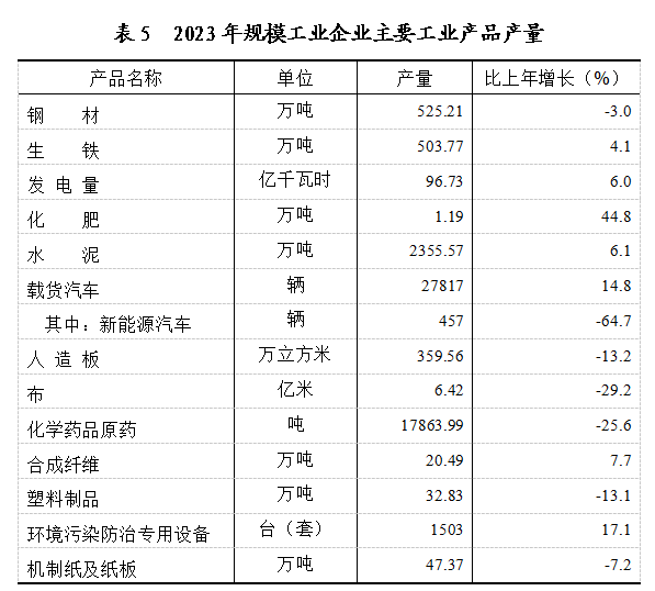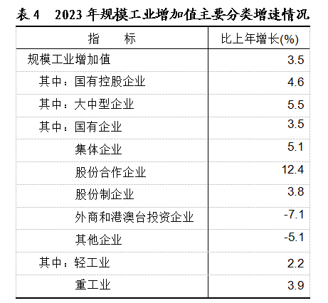 全年全部工业增加值比上年增长2.7%。规模以上工业增加值增长3.5%。在规模工业中,分经济类型看,国有控股企业增长4.6%;国有企业增长3.5%,集体企业增长5.1%,股份合作企业增长12.4%,股份制企业增长3.8%,外商及港澳台商投资企业下降7.1%;其他企业下降5.1%。分轻重工看,轻工业增大2.2%,重工业增长3.9%。分门类看,采矿业增长7.1%,制造业增长3.1%,电力、热力、燃气及水生产和供应业增长1.7%。工业产品销售率为97.72%,比上年提高0.37个百分点。