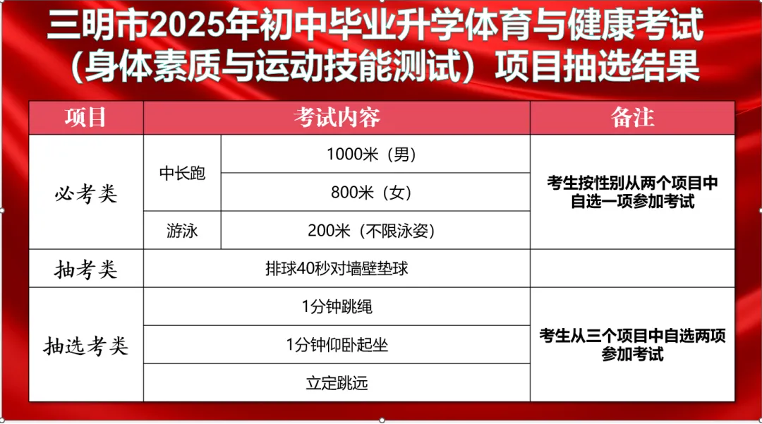 三明市2025年中考体育与健康抽选考项目确定