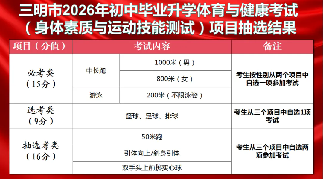 三明市2026年中考体育与健康抽选考项目确定