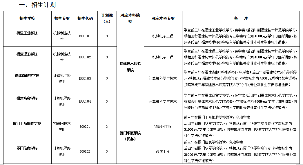 为进一步构建技术技能人才成长“立交桥”,推动不同层次职业教育纵向贯通、横向贯通,今年福建省首次开展中职本科“3+4”贯通培养试点,确定福建技术师范学院、厦门华厦学院(民办)、泉州职业技术大学(民办)3所本科院校和福建工业学校、福建理工学校、福建省邮电学校、福建商贸学校、厦门工商旅游学校、厦门信息学校、晋江职业中专学校、晋江华侨职业中专学校、晋江晋兴职业中专学校、晋江安海职业中专学校等10所公办中职学校作为试点。其中,面向三明市下达招生计划30人。