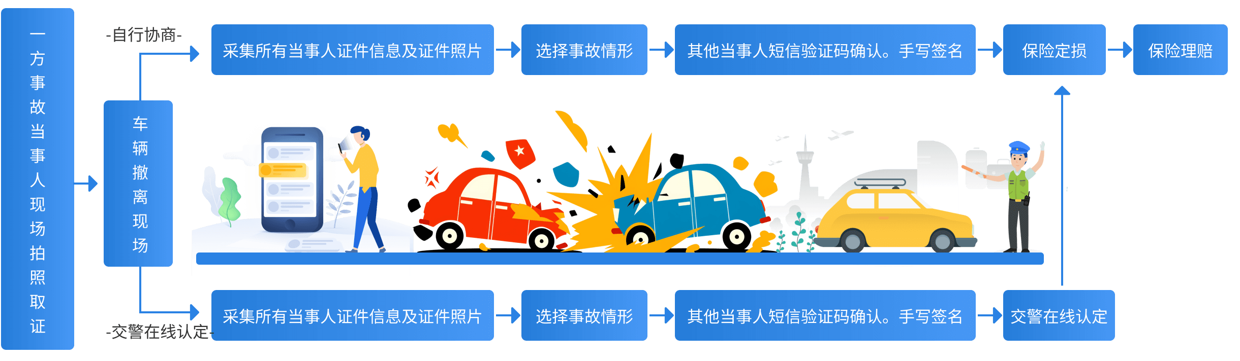 凡是在福建省范围内投保,在我市发生不涉及人员伤亡、且车辆不经施救能自行移动的交通事故,各方当事人可不用向110指挥中心报警,在对事故现场进行拍照固定并互相查验驾驶证、行驶证、保险凭证及互拨互留电话后,直接撤离现场,选择快处中心一站式办理事故定责、车辆定损、保险理赔、纠纷调解等事项。