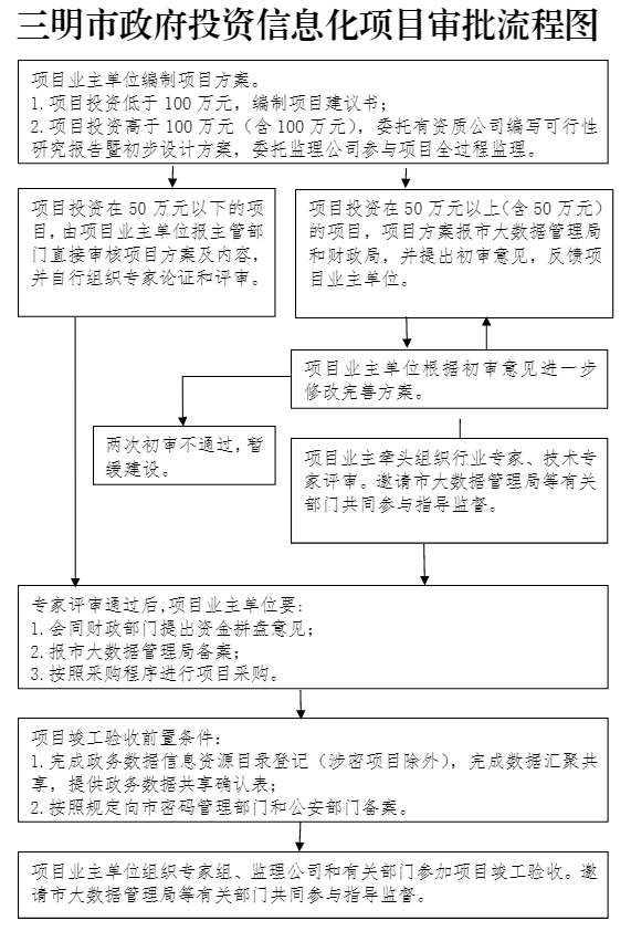 第十一条 项目方案编制完成后,项目投资在50万元以下的项目,由项目业主单位报主管部门直接审核项目方案及内容,并自行组织专家论证和评审;项目投资在50万元以上(含50万元)的项目,填写三明市政府投资信息化项目审批表(详见附件4),分别报市大数据管理局、财政局初审后备案,根据省市工作要求和信息化发展情况,由市大数据管理局会同市财政局提出审查意见,两次初审不通过的信息化项目暂缓建设。