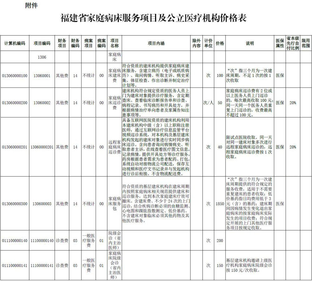 附件: 福建省家庭病床服务项目及公立医疗机构价格表