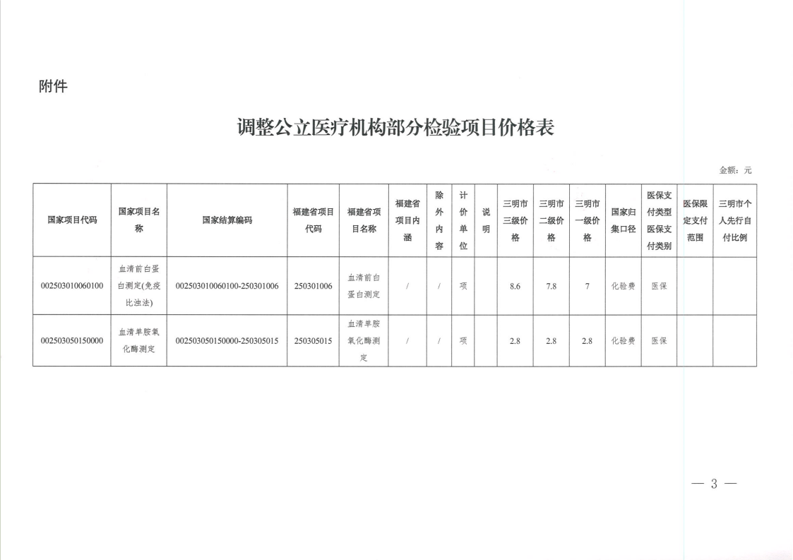 根据《福建省医疗保障局关于进一步理顺检查检验医疗服务项目价格的通知》(闽医保〔2024〕42号)文件精神,进一步理顺部分检验医疗服务项目价格,调低血清前白蛋白测定、血清单胺氧化酶测定2项价格(详见附件)。各派出机构、市医保中心要抓好属地落实工作;市医保中心、各定点医疗机构要及时做好本单位信息系统的维护与更新。
