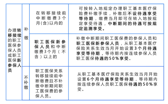 职工医保参保人员因各种原因中断医保关系,中断前后实际缴费年限合并计算,医保待遇按下列办法处理: