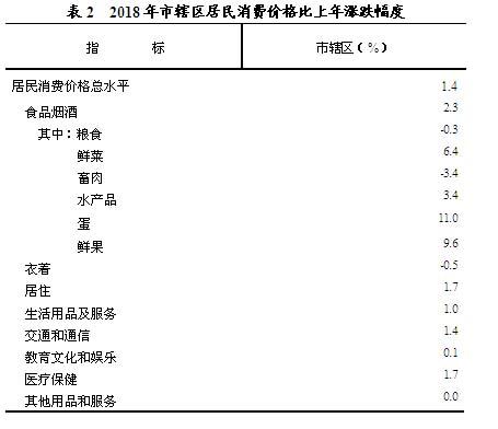 市辖区全年居民消费价格比上年上涨1.4%,其中食品烟酒价格上涨2.3%。商品零售价格上涨 1.4%。全市工业生产者出厂价格上涨5.6%。