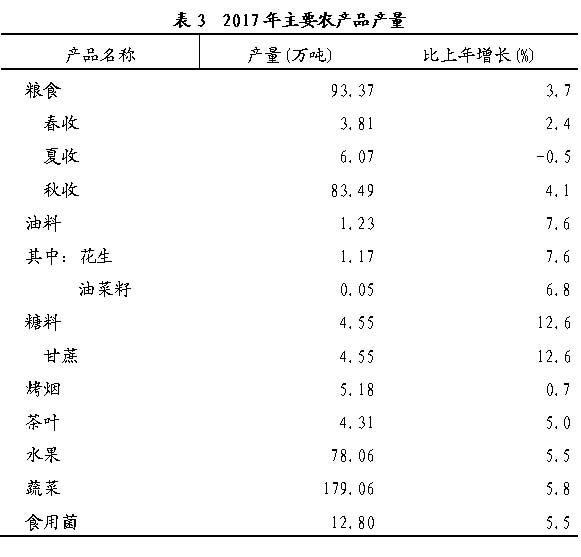全年粮食产量93.37万吨,比上年增加3.37万吨,增长3.7%。其中,稻谷产量78.28万吨,增产2.58万吨,增长3.4%。