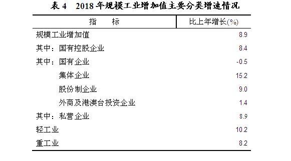 全年全部工业增加值1012.09亿元,比上年增长8.9%。规模工业增加值增长8.9%。在规模工业中,分经济类型看,国有控股企业增长8.4%;国有企业下降0.5%,集体企业增长15.2%,股份制企业增长9.0%,外商及港澳台商投资企业增长1.4%;私营企业增长8.9%。分轻重看,轻工业增长10.2%,重工业增长8.2%。分门类看,采矿业增长11.4%,制造业增长8.7%,电力、热力、燃气及水生产和供应业增长6.8%。工业产品销售率98.95%,比上年下降0.09个百分点。