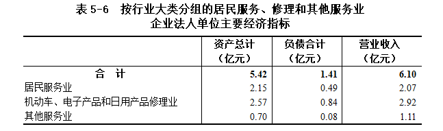 2018年末,居民服务、修理和其他服务业企业法人单位资产总计5.42亿元,比2013年末增长41.1%。负债合计1.41亿元。全年实现营业收入6.10亿元(详见表5-6)。