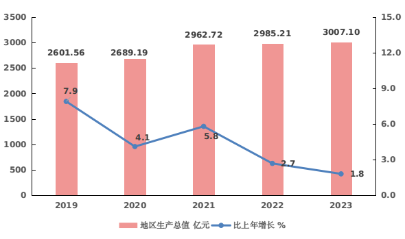 初步核算,全年实现地区生产总值3007.10亿元,比上年增长1.8%。其中,第一产业增加值355.08亿元,增长4.6%;第二产业增加值1342.53亿元,与上年持平;第三产业增加值1309.49亿元,增长3.0%。第一产业增加值占地区生产总值的比重为11.8%,第二产业增加值比重为44.6%,第三产业增加值比重为43.5%。全年人均地区生产总值123141元,比上年增长2.8%。