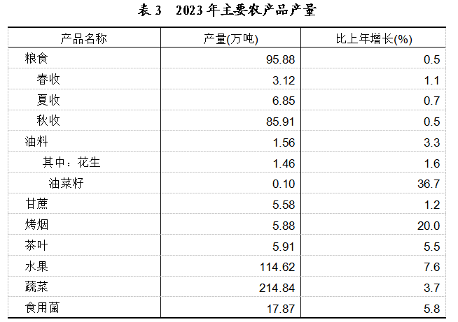 全年农林牧渔业完成总产值600.61亿元,比上年增长4.6%。粮食种植面积243.10万亩,增加0.80万亩,其中稻谷面积177.77万亩,增加0.29万亩;烟叶种植面积45.08万亩,增加6.48万亩;油料种植面积9.24万亩,增加0.32万亩;蔬菜种植面积126.97万亩,增加3.21万亩。