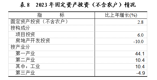 全年固定资产投资比上年增长2.8%。第一产业投资增长44.1%;第二产业投资增长10.4%;第三产业投资下降4.9%。其中,工业投资增长10.4%,占固定资产投资的比重为48.6%。基础设施投资增长15.1%,占固定资产投资的比重为22.0%。民间投资增长6.4%,占固定资产投资的比重为59.1%。高技术产业投资增长29.6%。全年到位资金比上年增长5.9%。