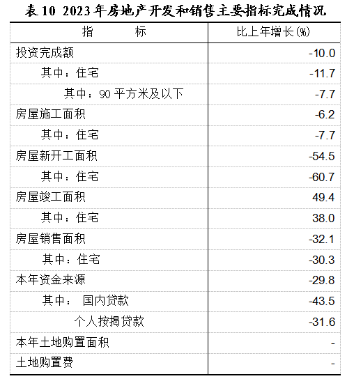 全年房地产开发投资比上年下降10.0%。其中,住宅投资下降11.7%;办公楼投资下降55.9%;商业营业用房投资下降8.1%。
