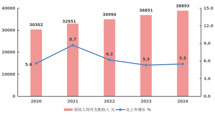 图8 2020-2024年居民人均可支配收入及其增长速度