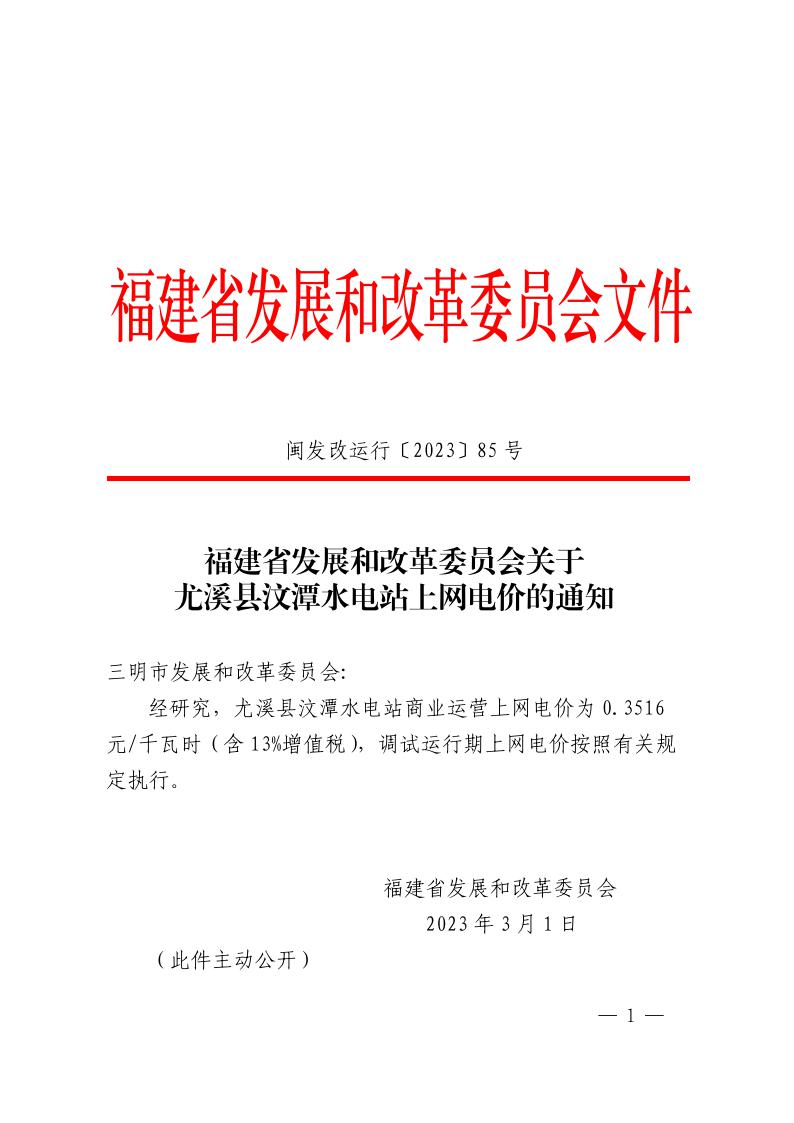 福建省发展和改革委员会关于尤溪县汶潭水电站上网电价的通知