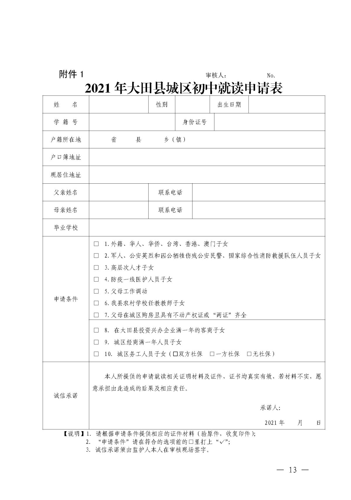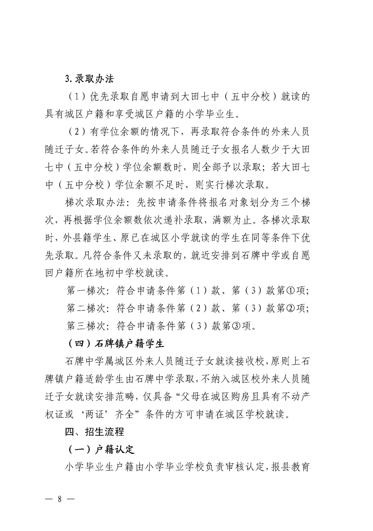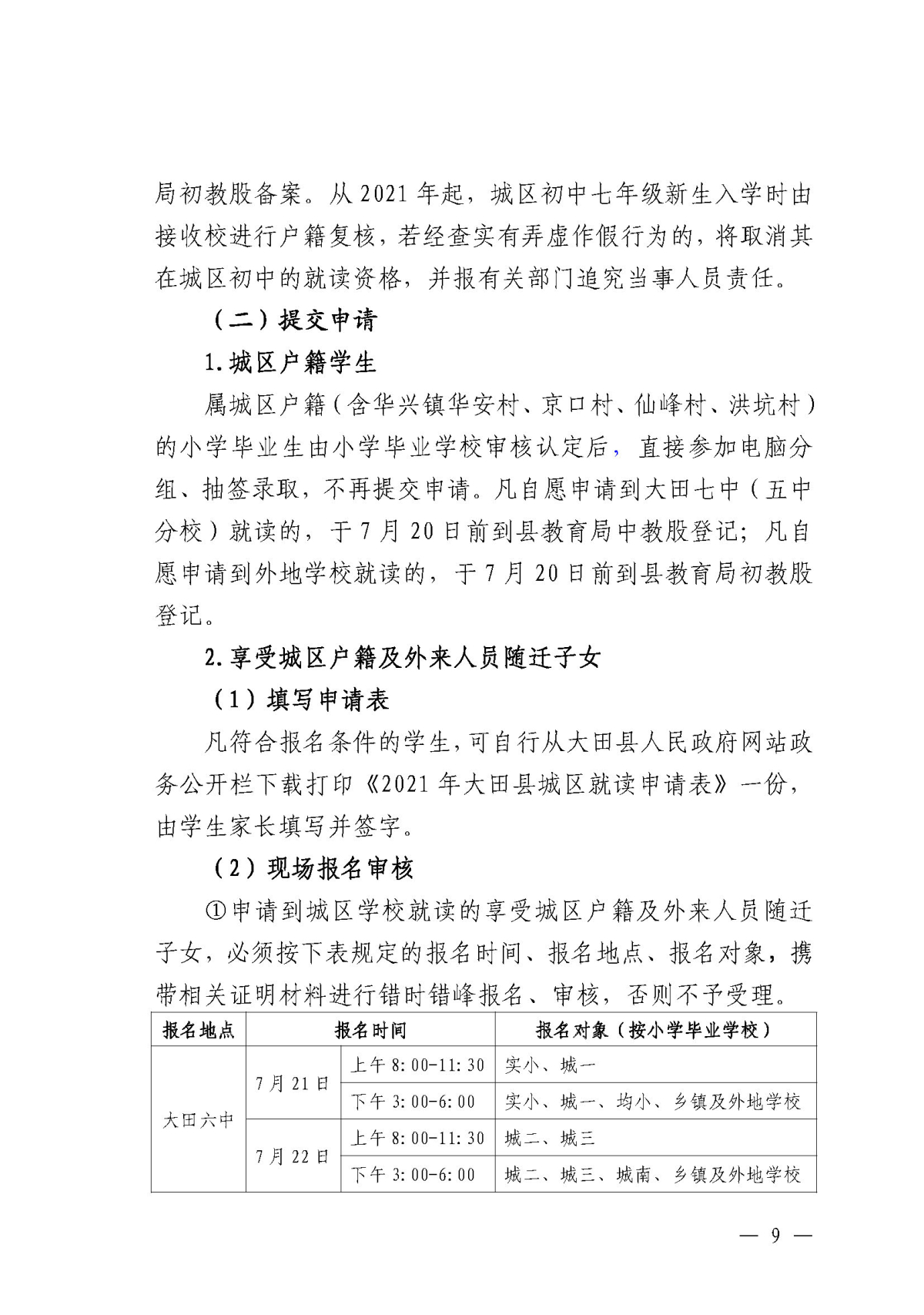 大田县人民政府办公室关于印发大田县2021年城区初中招生工作方案的通知