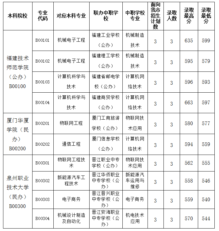 今年福建省3所本科院校与10所公办中职学校联合开展中职本科“3+4”贯通培养试点项目,面向我市招生计划共30人,录取分数情况如下:
