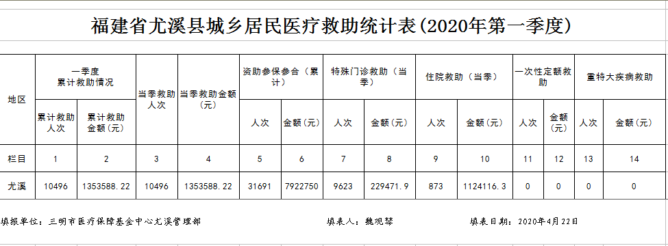 福建省尤溪县城乡居民医疗救助统计表(2020年第一季度)