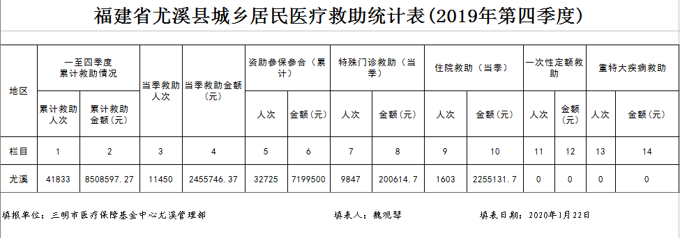 福建省尤溪县城乡居民医疗救助统计表(2019年第四季度)