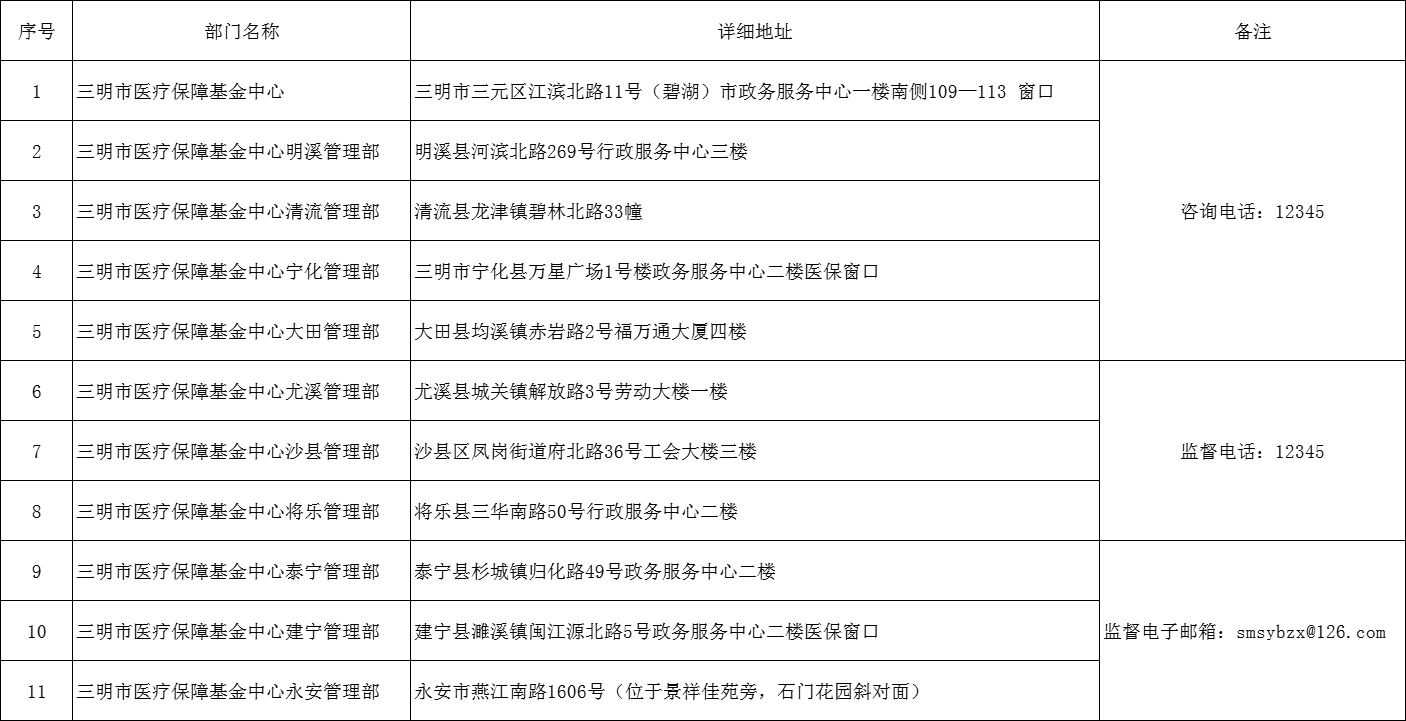三明市医保中心及各县(市、区)管理部主要业务科室咨询电话