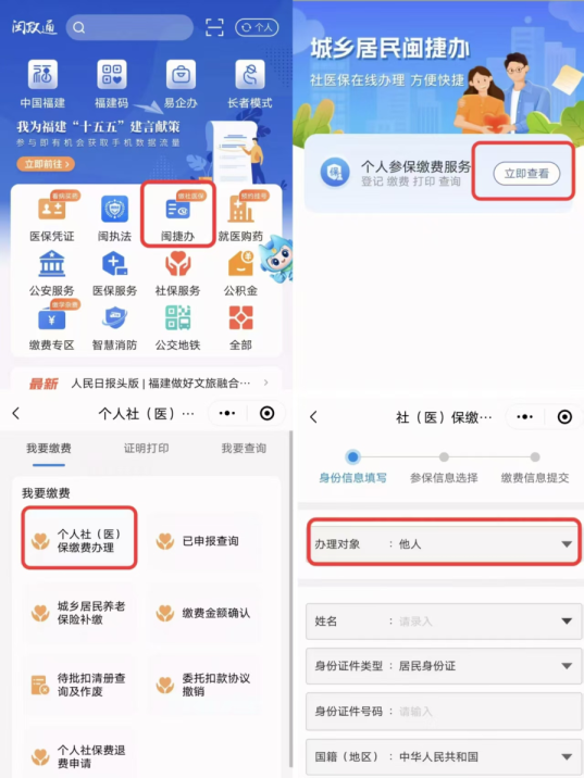 打开闽政通app→进入【闽捷办】办理页面,点击【立即查看】进入个人参保缴费服务页面→点击【个人社(医)保缴费办理】→在【社(医)保缴费办理】页面,选择为本人或他人办理,确认身份信息无误后,根据提示进行缴费。