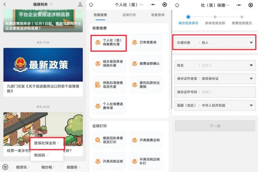 微信搜索关注“福建税务”微信公众号,点击【微办税】-【医保社保业务】→点击【个人社(医)保缴费办理】→首次办理业务时需通过“闽政通”实名认证→在【社(医)保缴费办理】页面,选择为本人或他人办理,确认身份信息无误后,根据提示进行缴费。