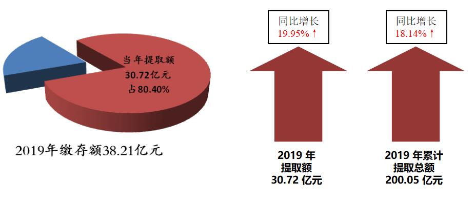 2019年住房公积金提取额30.72亿元,同比增长19.95%,占当年缴存总额的80.40%;2019年末累计提取总额200.05亿元,较比上年末增长18.14%。