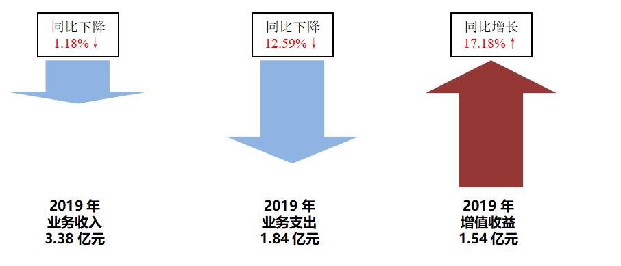 2019年业务收入3.38亿元,同比下降1.18%;业务支出1.84亿元,同比下降12.59%;实现增值收益1.54亿元,同比增长17.18%。
