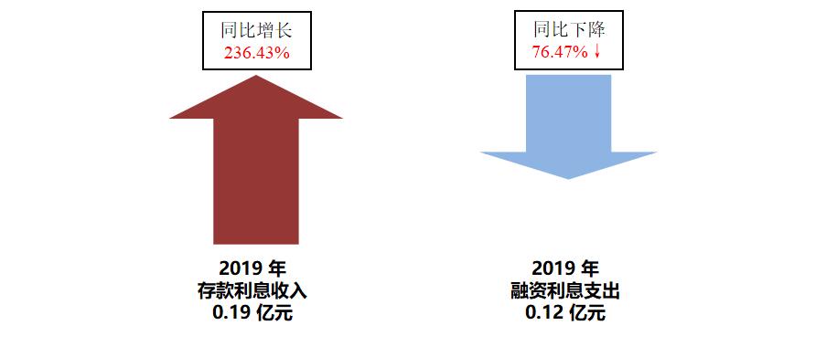 2019年存款利息收入0.19亿元,同比增长236.43%;融资利息支出0.12亿元,同比下降76.47%。