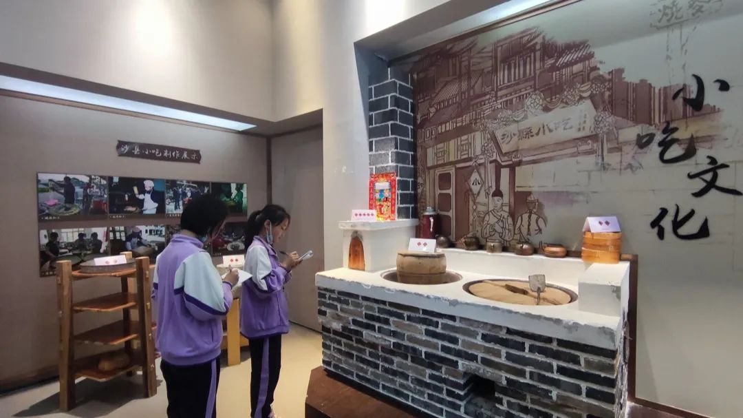 随后,同学们在老师的带领下来到了沙县小吃风情馆,展馆内“溯源传话美食”“沙村人家食为天”“小吃文化系风情”三幅画卷徐徐展开,同学们通过了解沙县人民的奋斗史,体会沙县的文化传统、风土人情。