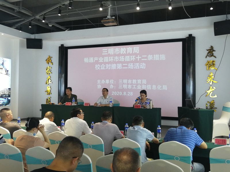 8月28日,市教育局在三明怡程酒店开展畅通产业循环市场循环十二条措施校企第二场对接活动。市教育局副局长刘若嘉、市工信局副调研员谢丽华参加活动。来自各县(市、区)教育局分管副局长、仪器装备股室负责人,新建校校长,市直属学校分管副校长,以及空调、安防、纺织、家具、灯具等12家企业代表,共计90多人参加对接活动。