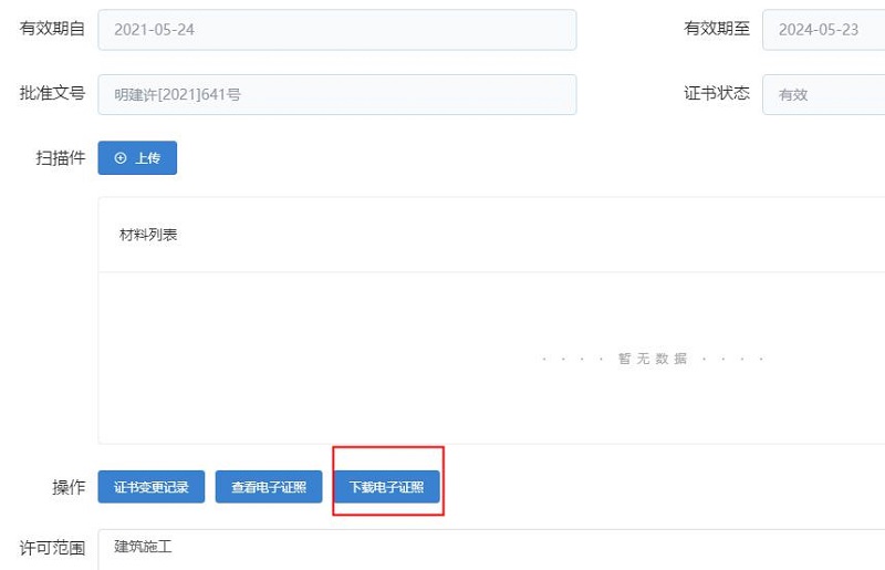 根据住建部及省住建厅相关工作要求,市住建局于近日完成了对建筑施工企业安全生产许可证电子证照的国标改造工作。2023年7月1日起,我市全面启用建筑施工企业安全生产许可证国标电子证照,主管部门审批后,无需再颁发纸质证书,企业端即可自行打印电子证书。
