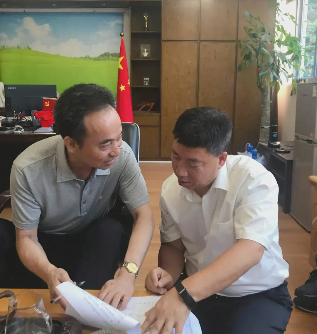 ▲ 5月18日,詹积富在办公室与杨孝灯(右)探讨薪酬3.0版规则。本刊记者 杨中旭 摄