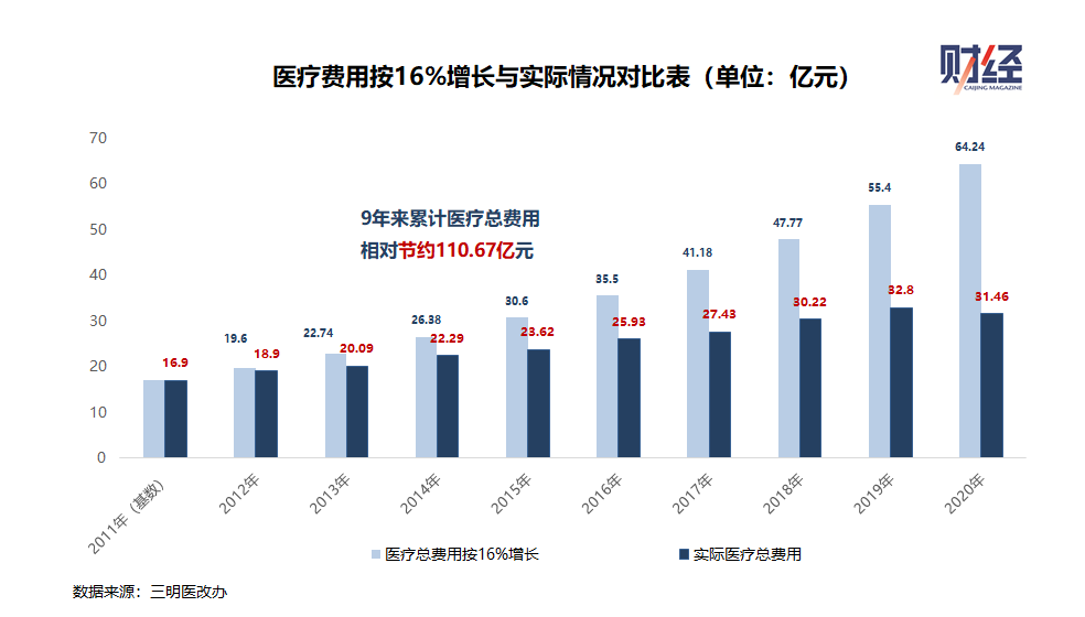 三明2012年以来的9年间,医疗总费用会增长至343.41亿元,实际为232.74亿元,相对节约110.67亿元(医保基金和老百姓减少支出);
