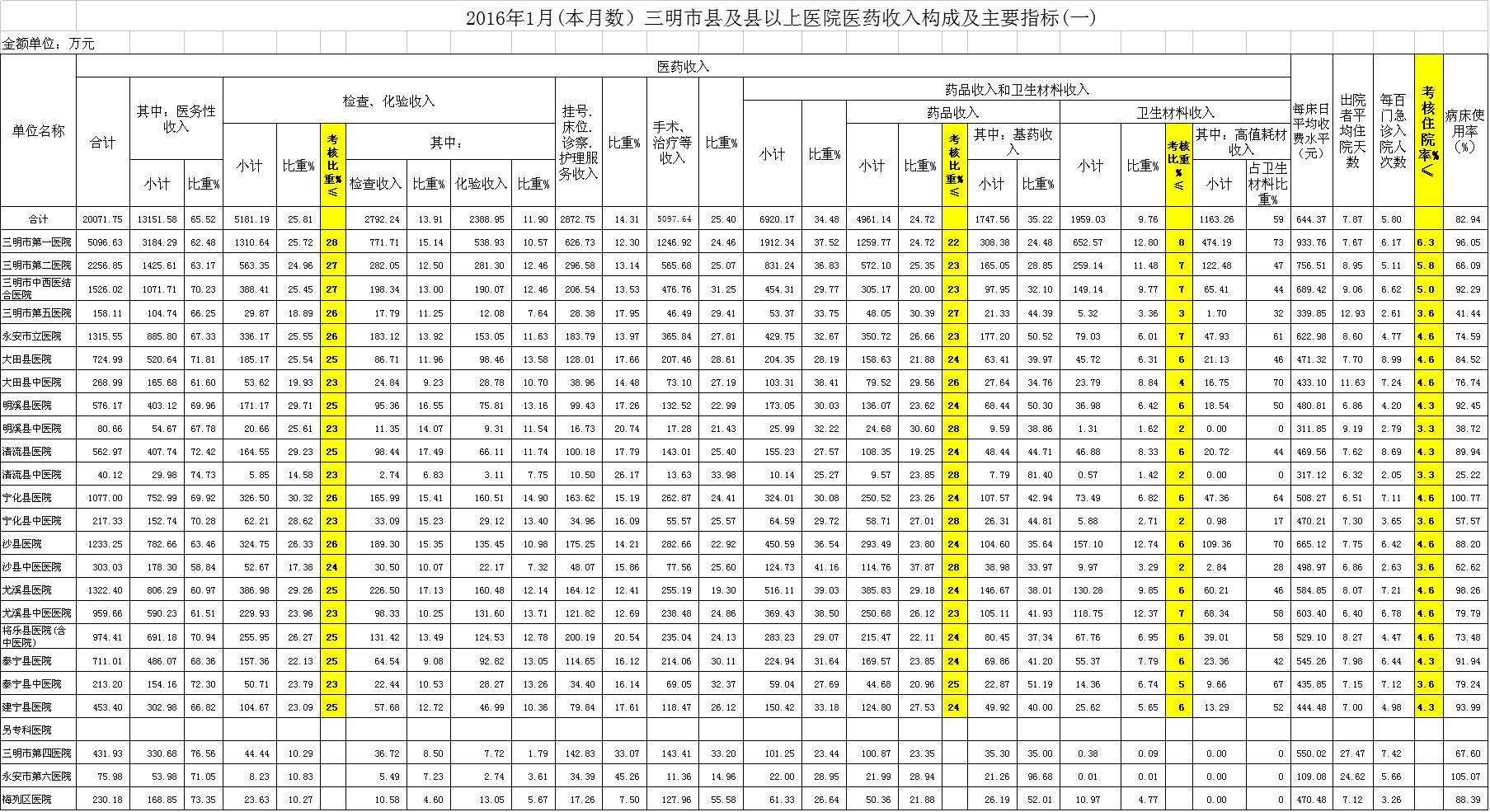 检查化验收入比。1月份21家县级以上医院检查化验收入占医药总收入的25.81%,比去年同期的27.16%,下降1.35个百分点,达标医院10家,超过核定数有11家医院,其中宁化县中医院超过5.62个百分点、明溪县医院超过4.71个百分点、宁化县医院超过4.32个百分点。