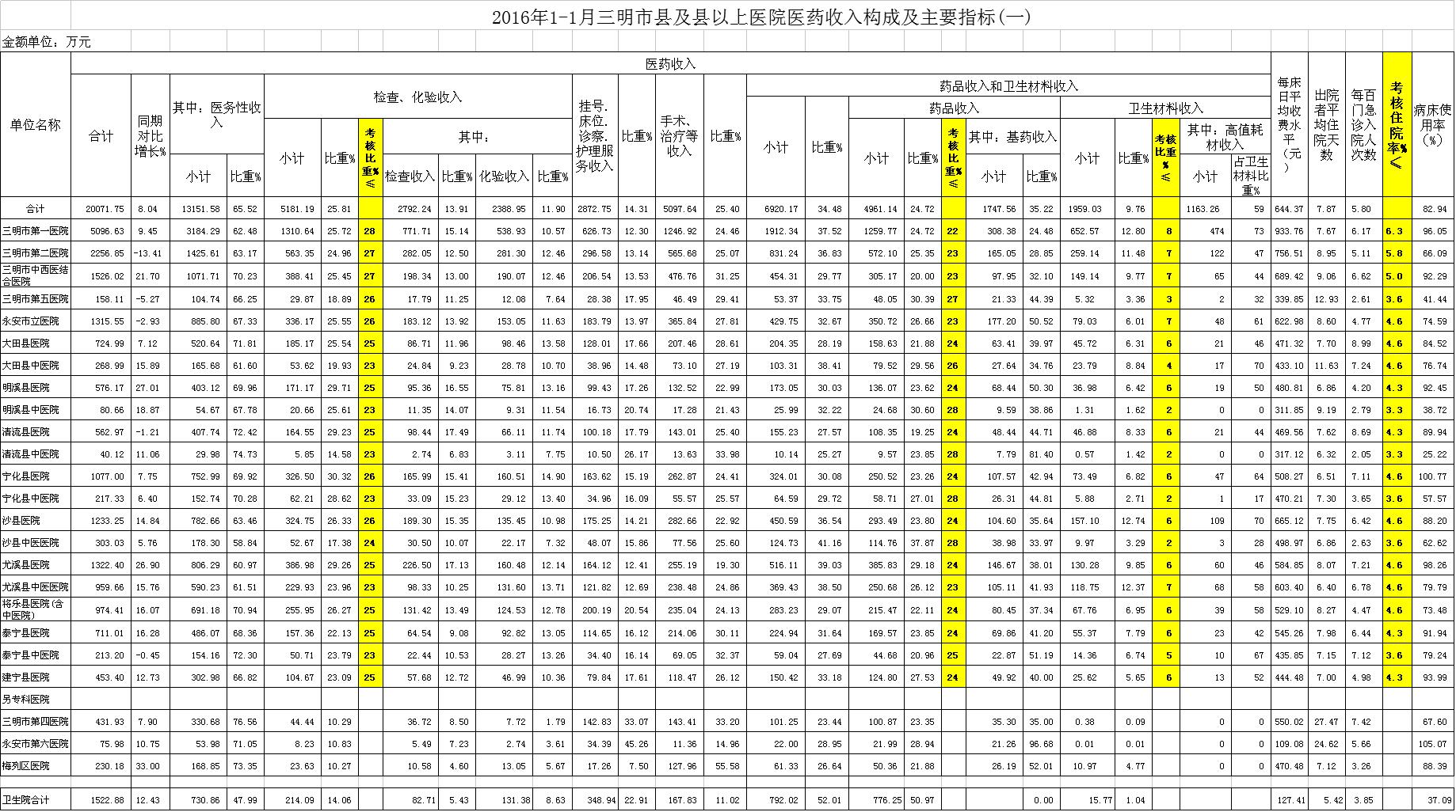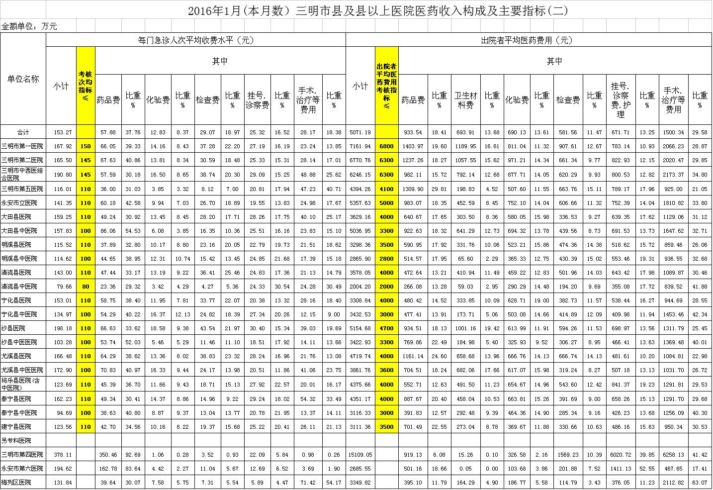 次均费用。1月份21家县级以上医院每门诊次均费用153.27元,比去年同期的144.42元,增加8.85元。达标医院2家(泰宁和清流县中医院),超标19家,其中沙县医院超过88.18元、尤溪县中医院超过72.90元、大田县中医院超过57.83元;出院者平均费用5071.19元,比去年同期4877.04元,增加194.15元,达标医院有6家,超标15家,其中大田县中医院超过1736.95元、尤溪县医院超过719.74元、市第二医院超过470.76元。