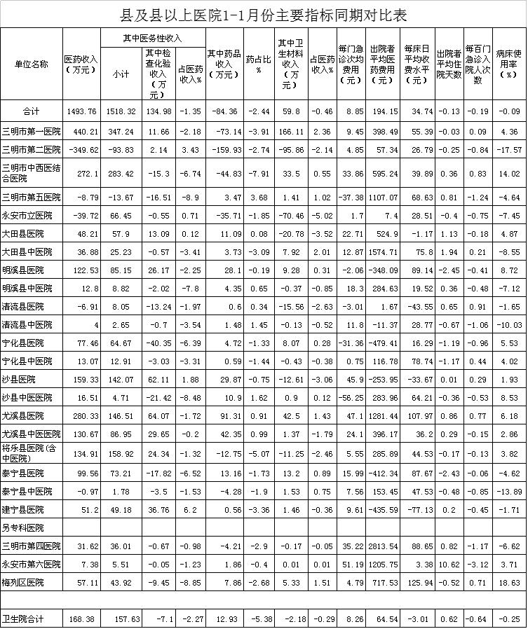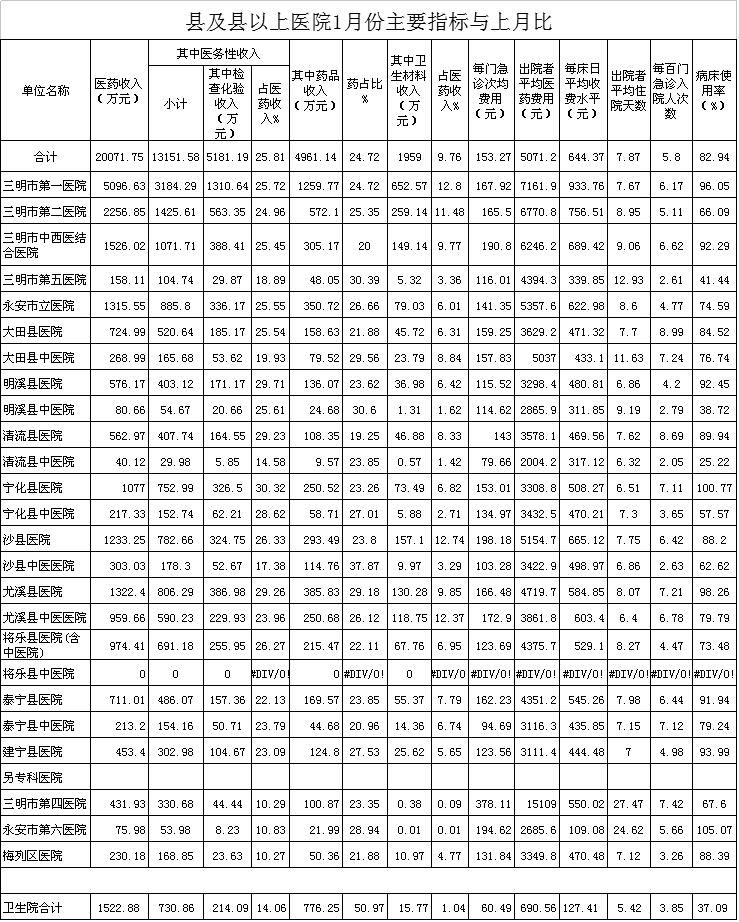 医药总收入。1月份21家县级以上医院医药总收入同比增长8.04%,增长超过8%有11家医院,其中明溪县医院同比增长27.01%、尤溪县医院同比增长26.9%、市中西医结合医院同比增长21.70%。
