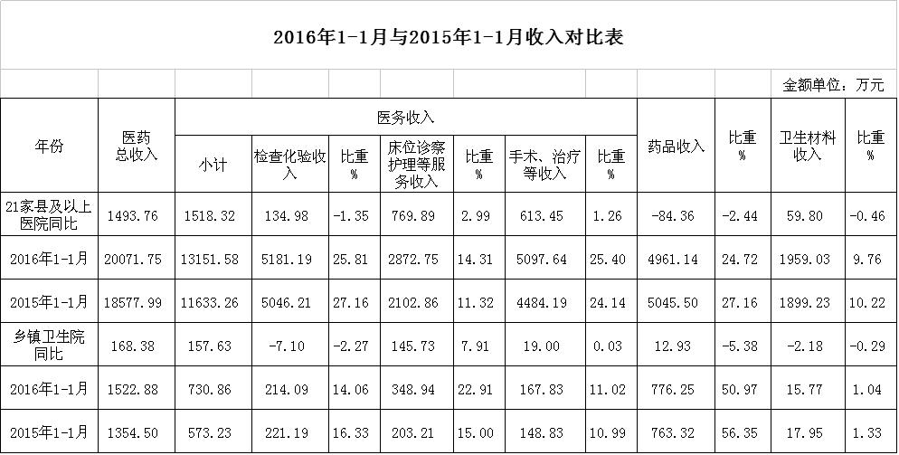 (一)1月份21家县级以上医院:医药总收入20071.75万元,比去年同期18577.99万元,增加1493.76万元,同比增长8.04%(药品收入同比下降1.67%)。其中:医务性收入13151.58万元,占医药收入65.52%(检查化验收入5181.19万元、手术治疗护理等服务收入7970.39万元),比去年同期11633.26万元,医务性收入增加1518.32万元增长13.05%;药品收入4961.14万元,药占比24.72%,分别比去年同期5045.50万元、27.16%,药品收入减少84.36万元、药占比下降2.44个百分点;卫生材料收入1959.03万元(其中高值耗材收入1163.26万元),占医药总收入9.76%,比去年同期10.22%,下降0.46个百分点。入院人次24753人次,比去年同期24985人次,减少232人次,下降0.93%;门急诊人次426810人次,比去年同期417245人次,增加9565人次,增长2.29%;每门诊次均费用153.27元,比去年同期144.42元,增加8.85元,增长6.13%;出院者平均费用5071.19元,比去年同期4877.04元,增加194.15元,增长3.98%。