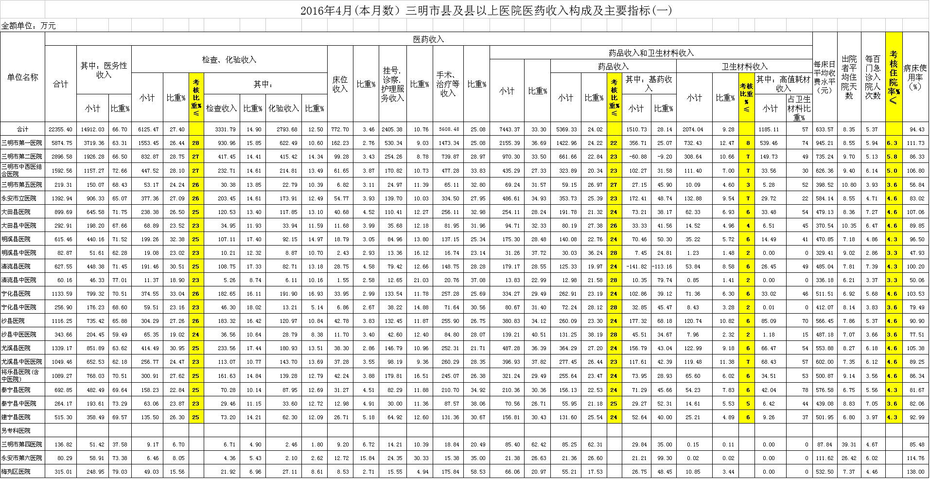 检查化验收入比。4月份21家县级以上医院检查化验收入占医药总收入的27.40%,比去年同期的28.04%,下降0.64个百分点,达标医院5家,超过核定数有16家医院,其中明溪县医院超过7.38个百分点、宁化县医院超过7.04个百分点、尤溪县医院超过5.95个百分点。
