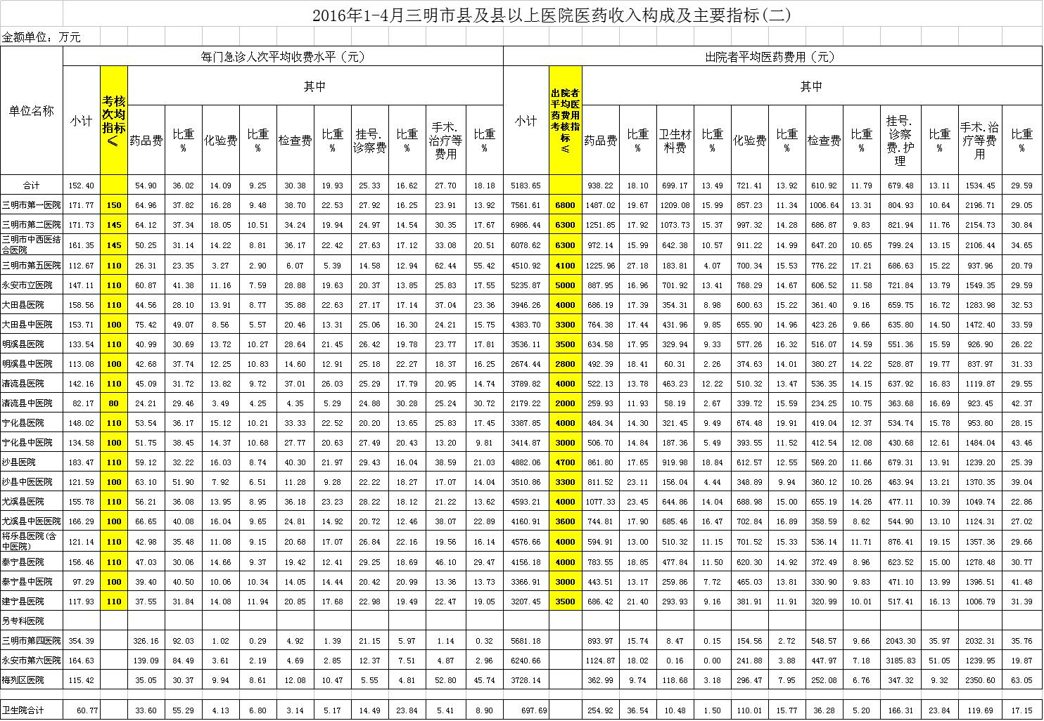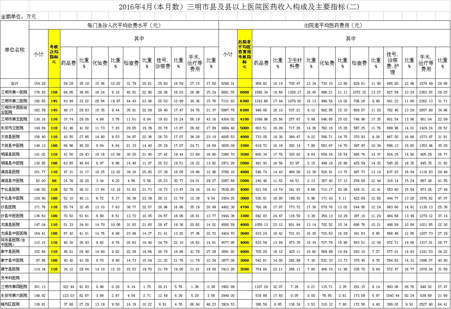 次均费用。4月份21家县级以上医院每门诊次均费用154.28元,比去年同期的147.07元,增加7.21元。达标医院1家(泰宁县中医院),超标20家,其中尤溪县中医院超过64.41元、沙县医院超过61.76元、大田县中医院超过48.13元;出院者平均费用5442.37元,比去年同期5072.64元,增加369.73元,达标医院有7家,超标14家,其中宁化县医院超过1396.43元、市第一医院超过1281.55元、泰宁县中医院超过877.08元。