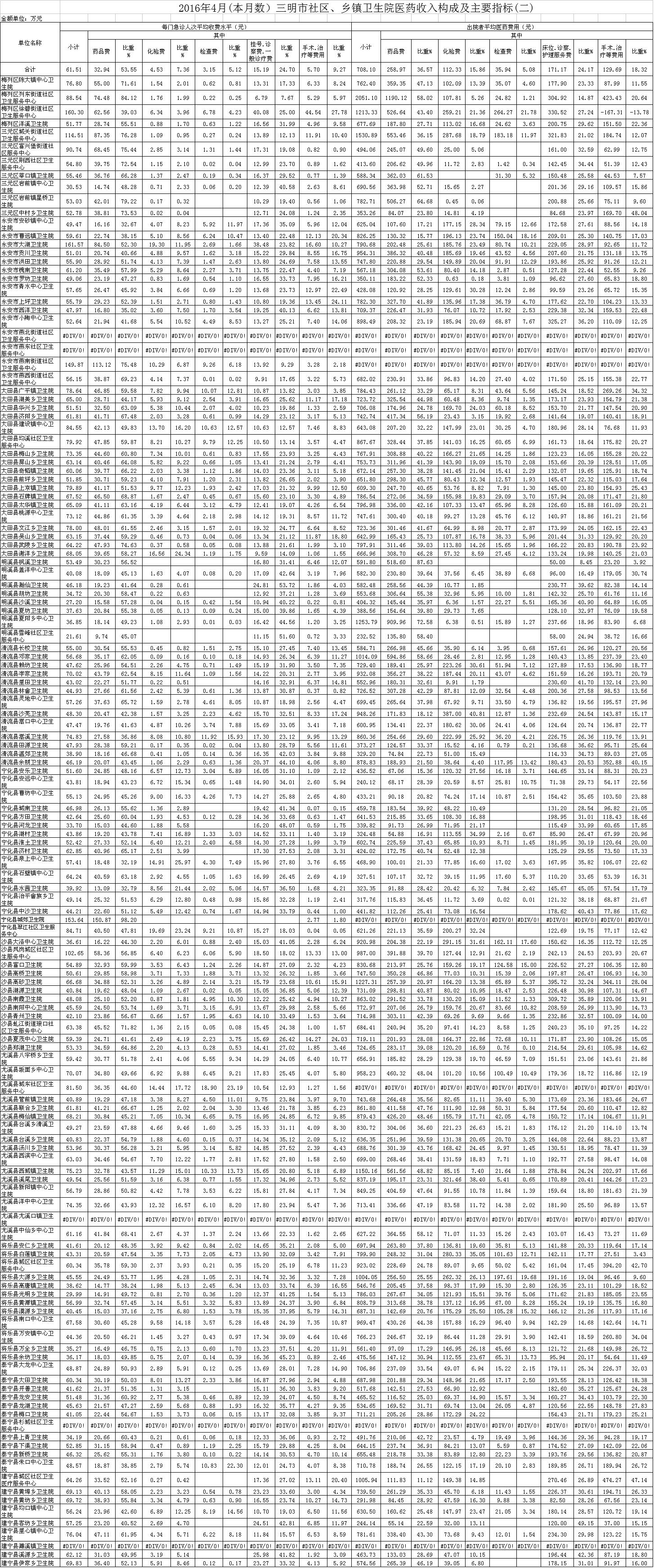 1-4月份基层医疗机构医药总收入7206.52元,去年同期6304.26万元,同比增加902.26万元,增长14.31%,其中:医务性收入3593.23万元,占医药收入49.86%(检查化验收入1070.59万元、床位收入270.4万元、手术治疗护理等服务收入2252.24万元),去年同期2790.26万元,医务性收入同比增加802.97万元,增长28.78%;药品收入3550.59万元,去年同期3435.52万元,同比增加115.27万元,增长3.36%,药占比49.27%,去年同期54.49%,同比下降5.22个百分点;卫生材料收入62.70万元,去年同期78.68万元,同比减少15.98万元,占医药收入0.87%,去年同期1.25%,同比下降0.38个百分点。入院人次33278人次,去年同期35838人次,同比减少2560人次,下降7.14%;门急诊人次804843人次,去年同期739067人次,同比增加65776人次,增长8.9%;每门诊次均费用60.77元,去年同期54.70元,同比增加6.07元,增长11.10%;出院者平均费用697.69元,去年同期632.03元,同比增加65.66元,增长10.39%。