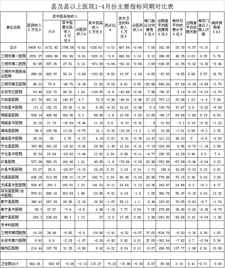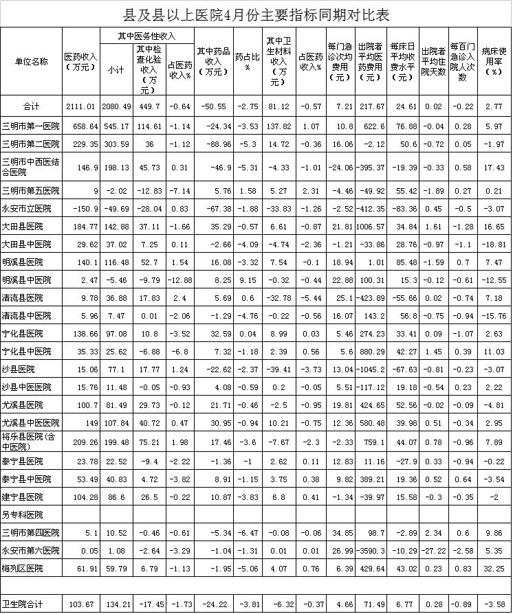 医药总收入。1-4月份21家县级以上医院医药总收入同比增长11.20%,增长超过8%有15家医院,其中明溪县医院同比增长27.77%、将乐县医院同比增长24.9%、清流县中医院同比增长23.99%。