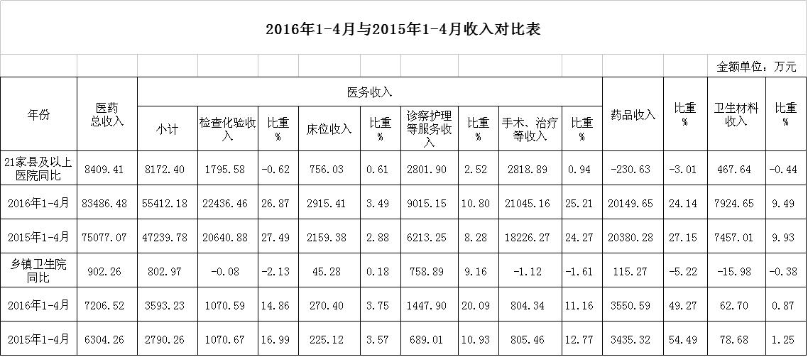 1.医药收入:4月份21家县级以上医院医药总收入22355.40万元,比去年同期20244.39万元,增加2111.01万元,同比增长10.43%。其中:医务性收入14912.03万元,占医药收入66.70%(检查化验收入6125.47万元、床位收入772.7万元、手术治疗护理等服务收入8013.86万元),比去年同期12831.54万元,医务性收入增加2080.49万元,同比增长16.21%;药品收入5369.33万元,比去年同期5419.88万元,减少50.55万元,下降0.93%。