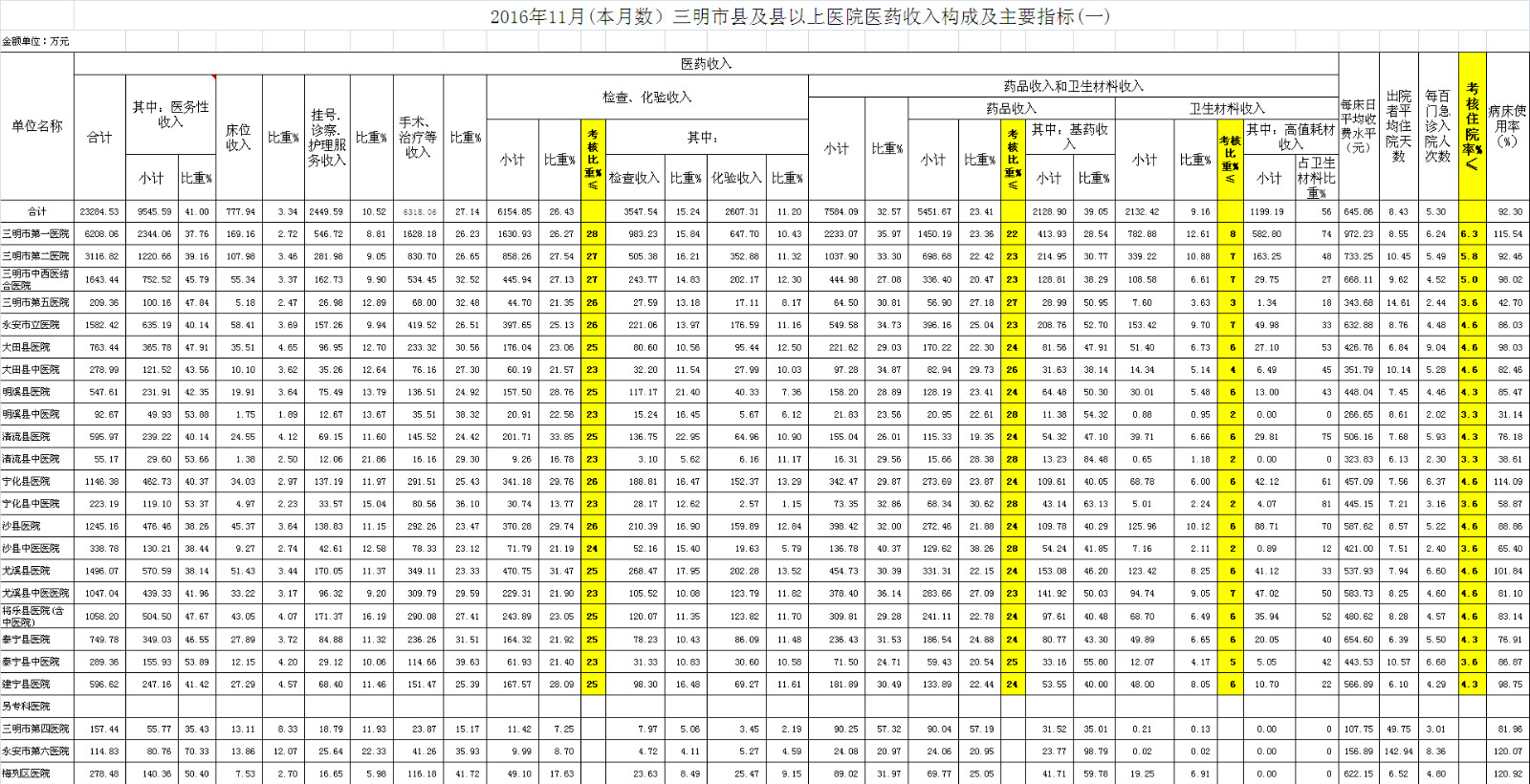 卫生材料占比。11月份21家县级以上医疗卫生材料收入占医药总收入的9.16%,比去年同期9.62%,下降0.46个百分点,达标医院4家,超过核定指标有17家医院,其中沙县医院超过5.14个百分点、市第二医院超过4.30个百分点、市第一医院超过4.09个百分点。