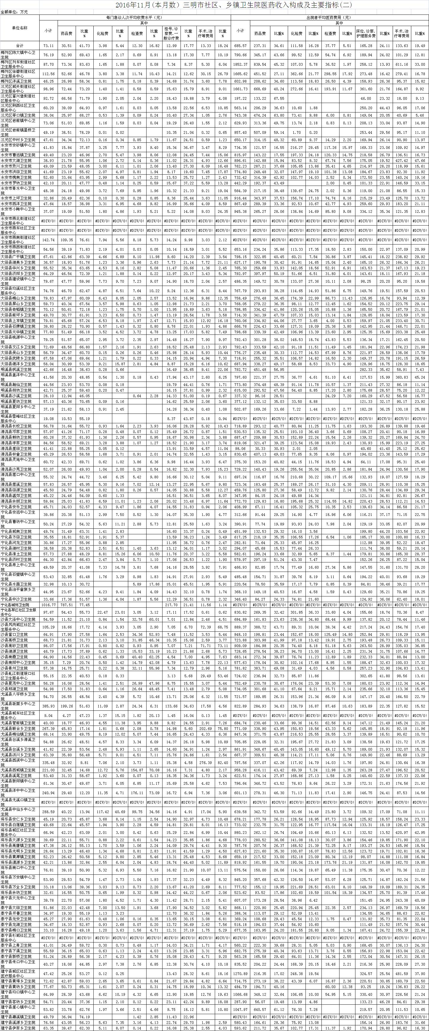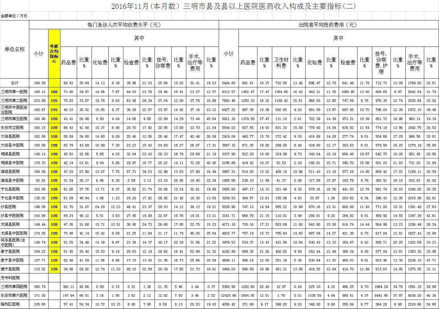 次均费用。11月份21家县级以上医院每门诊次均费用168.59元,比去年同期的157.21元,增加11.38元。达标医院3家,超标18家,其中沙县医院超过67.06元、大田县医院超过56.35元、尤溪县中医院超过48.76元;出院者平均费用5444.60元,比去年同期5158.11元,增加286.49元。